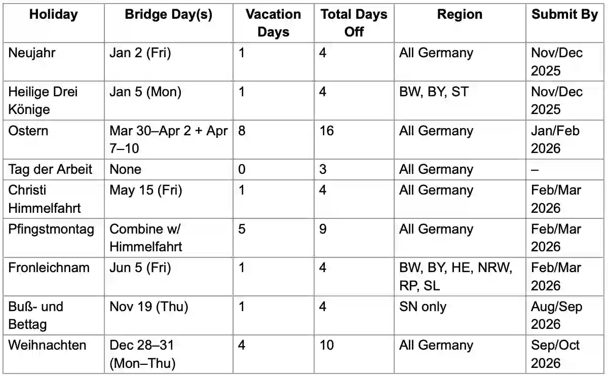 In Germany, public holidays (Feiertage) are your foundation. But Brückentage — those strategic “bridge days” between holidays and weekends — are where the magic happens.